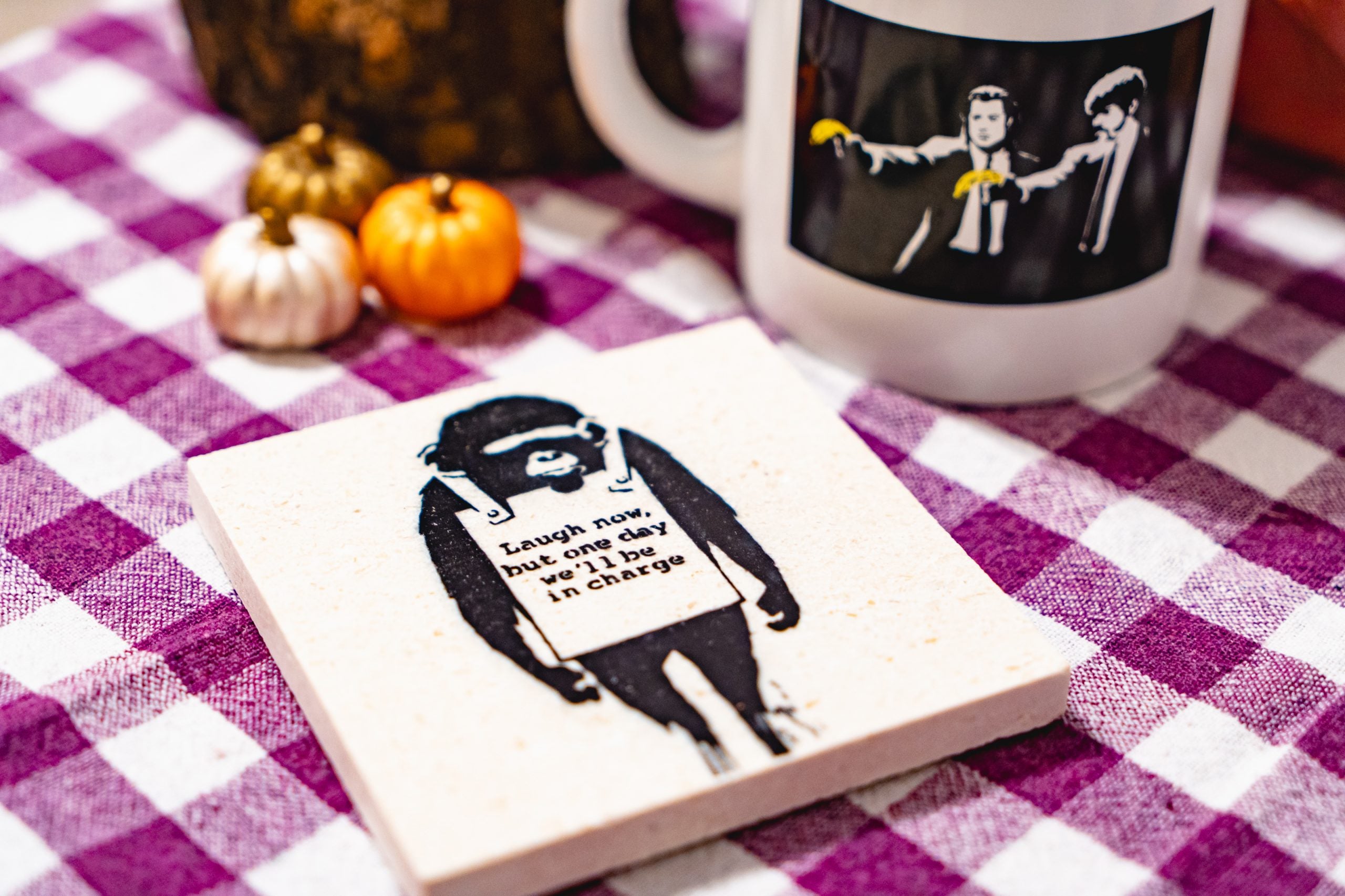 Diese Untersetzer sind aus hochwertigem, strapazierfähigem Material gefertigt, das gegen Flüssigkeit und Flecken beständig ist. Sie bieten eine praktische und ästhetische Lösung. Wenn Sie Farbe in Ihr Zuhause oder Büro bringen und gleichzeitig eine starke künstlerische Aussage teilen möchten, dann sind diese Untersetzer eine hervorragende Wahl.