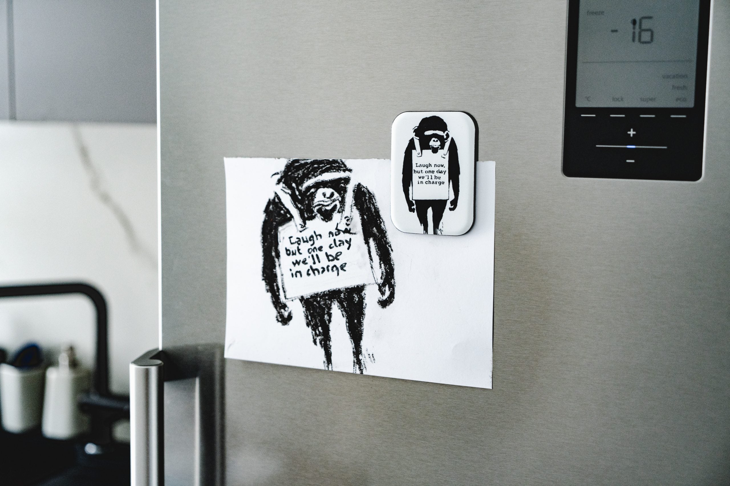 Deze speciaal ontworpen magneten, die kleur geven aan het oppervlak van uw koelkast en zowel kunstliefhebbers als mensen die elegantie waarderen fascineren, gaan verder dan een gewone magneet. De magie van Banksy-kunst: elke magneet is voorzien van unieke prints van de beroemdste werken van de gerenommeerde straatkunstenaar Banksy. Transformeer de sfeer in je huis direct in een artistieke en adembenemende ruimte. Afmetingen: H x B (cm): 8 x 6