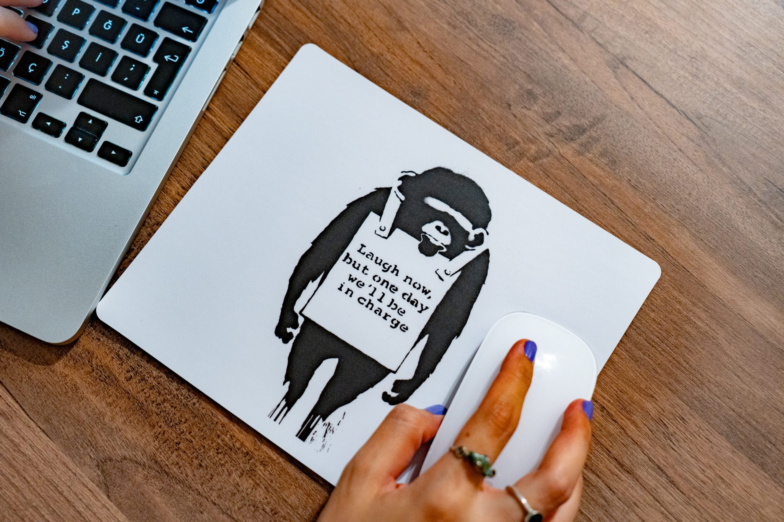 Unsere Mauspads mit Banksys ikonischem Kunstwerk sind eine Hommage an seine künstlerische Vision und bieten gleichzeitig eine hochwertige Oberfläche für die präzise Navigation auf Ihrem Computer. Bringen Sie einen Hauch von Street Art und Kreativität in Ihren Computeralltag mit unseren rutschfesten Mauspads mit Banksy-Kunstdrucken.